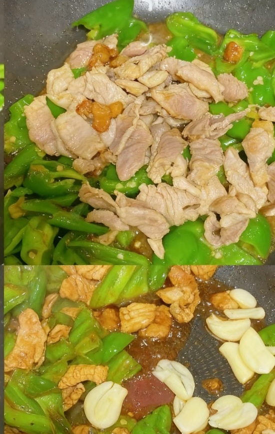 3. 锅里留底油,爆香蒜末+豆豉,青椒大火快炒40秒,看到边缘起“虎皮泡”就把肉片倒回,沿锅边淋半勺生抽、几滴老抽调色,兜炒10秒出锅。全程不超过3分钟,青椒保持“碧绿水灵”,肉片裹上“亮晶晶”的酱汁,完美!