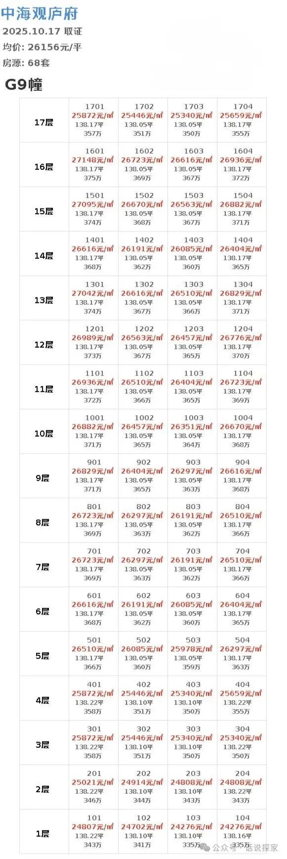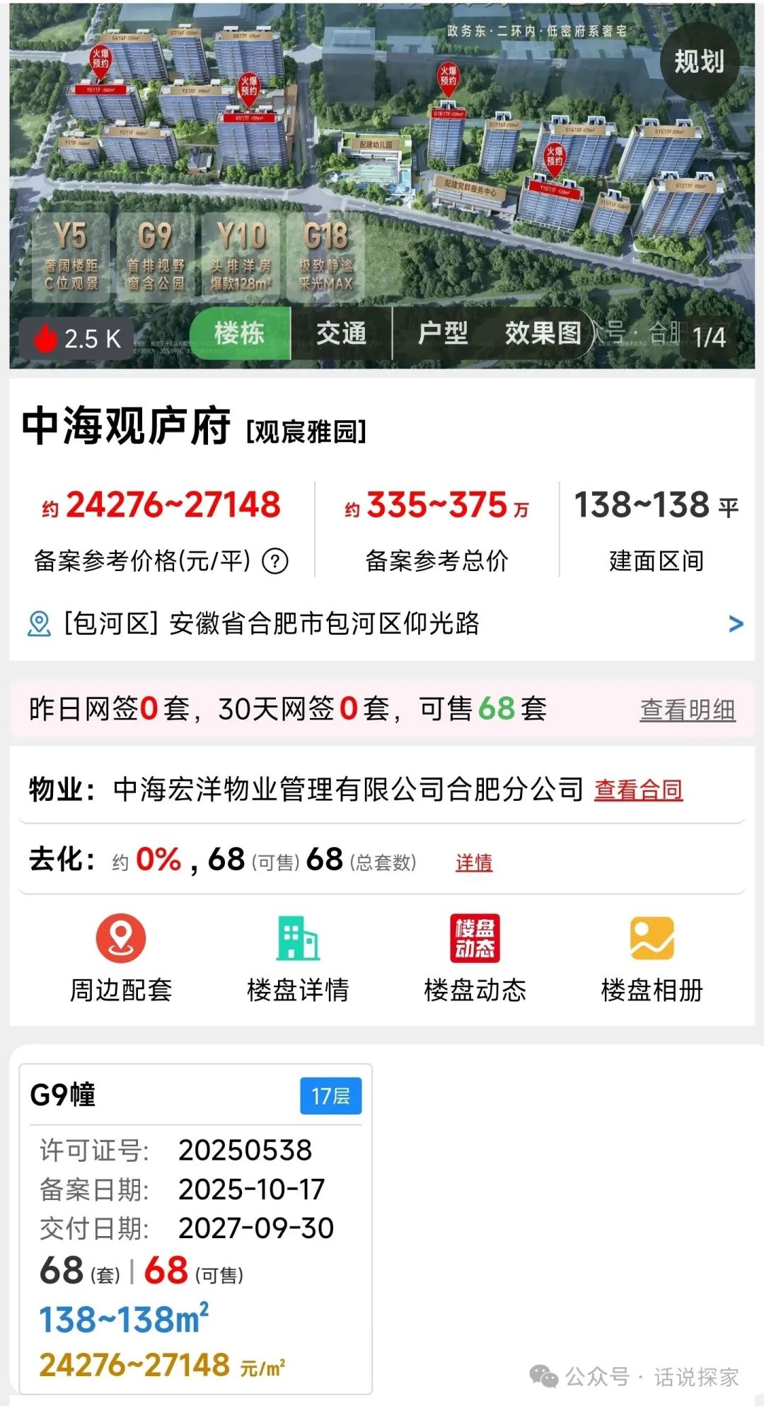 包河区中海观庐府已有1栋楼小高层已取证,共计68套房源,备案方面单价2.42-2.71万,总价335-375万左右,好楼层基本在2.6-2.7万,而其余楼栋暂未出来。