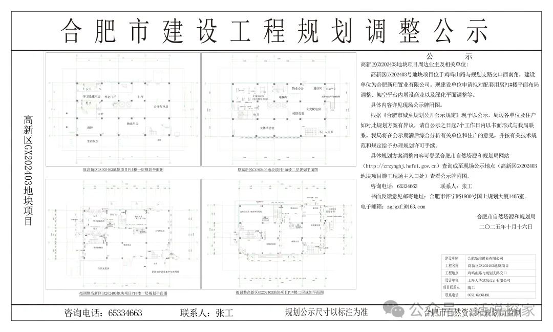 合肥城建高新区GX202403号地块规划方案调整公示,项目位于鸡鸣山路与规划支路交口西南角,建设单位为合肥新珀置业有限公司。