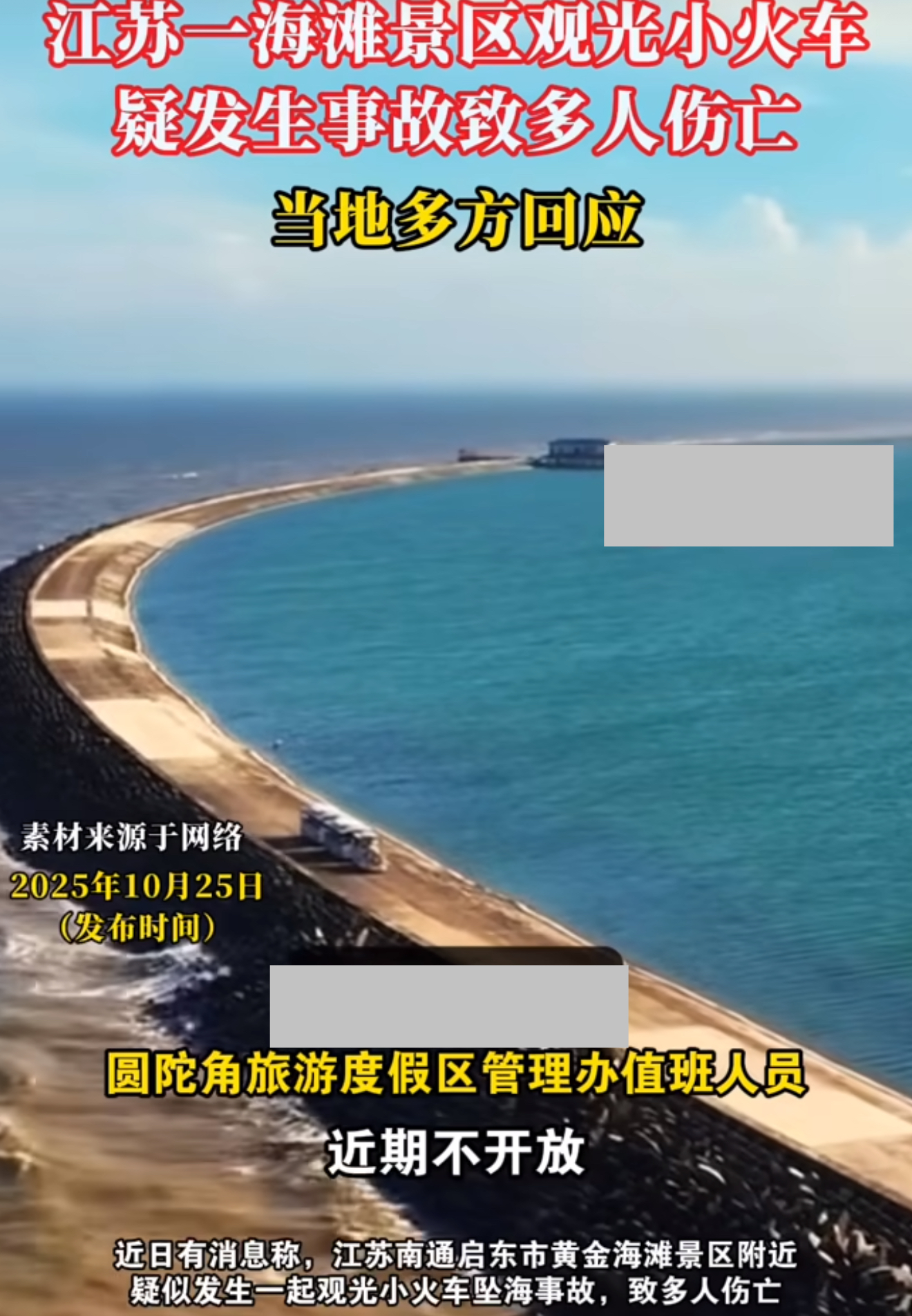 江苏启东黄金海滩的平静被一场突如其来的事故撕裂——一辆载着游客的观光小火车,在狂风巨浪中坠入水塘,四条生命永远停留在了那个被9级东北风席卷的下午。截至目前,官方虽未正式通报伤亡细节,但多方信源确认,事故造成4人遇难,其中3人来自上海,1人来自南京,伤者虽已出院,但这场悲剧留下的伤痕,远比身体上的伤口更痛。