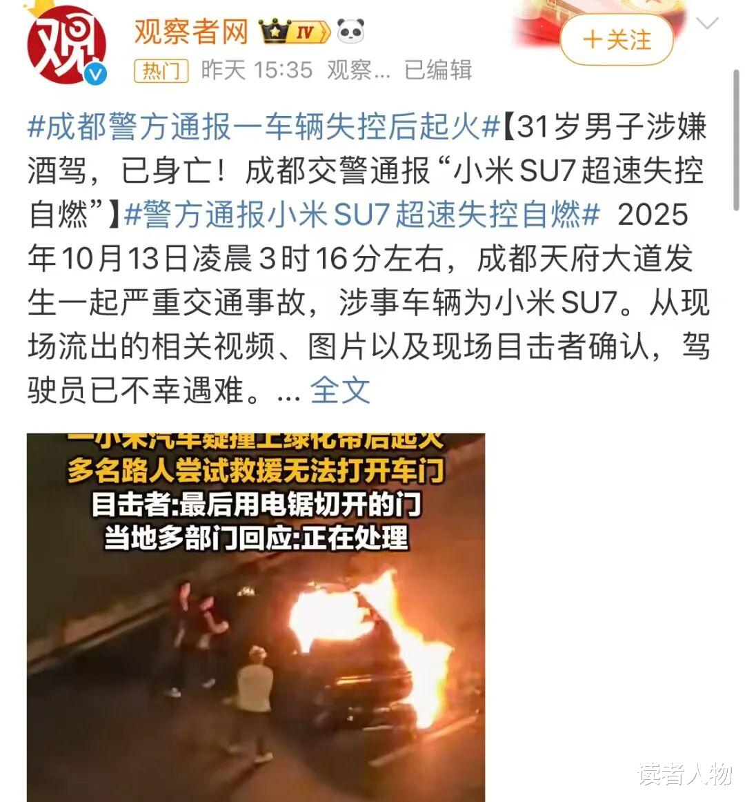 而这场暴跌的导火索,正是成都发生的一起小米SU7 Ultra碰撞燃爆事故。