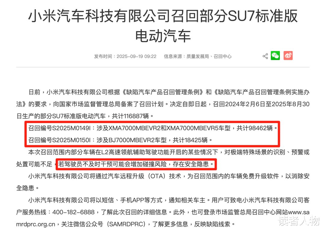 9月份,小米因L2高速领航辅助驾驶功能对极端场景处置不足,召回近11.7万辆SU7标准版。