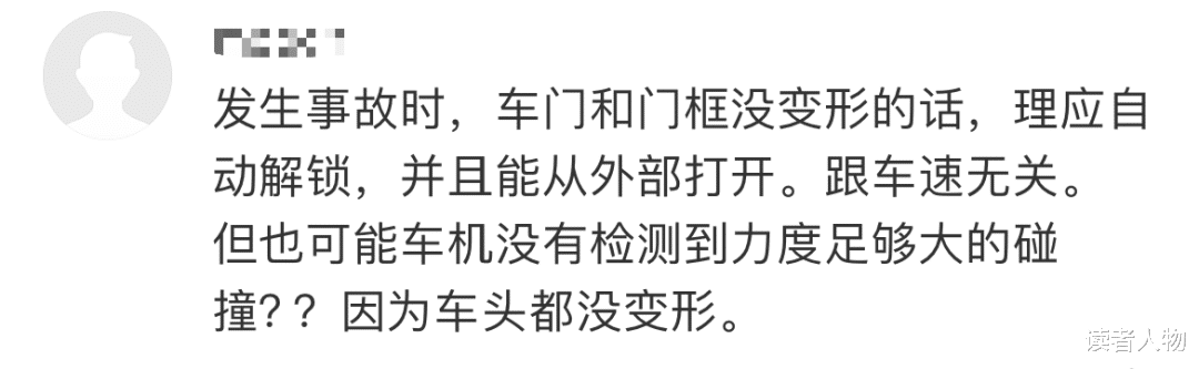 网友关心的究竟是车辆无法直接打开门,还是车辆碰撞之后电气系统失能造成的,亦或是物理结构变形导致门卡住——“多大撞击力度能触发该功能”的核心问题,同样并未给出明确答案。