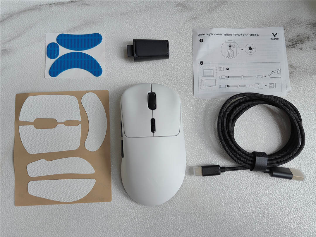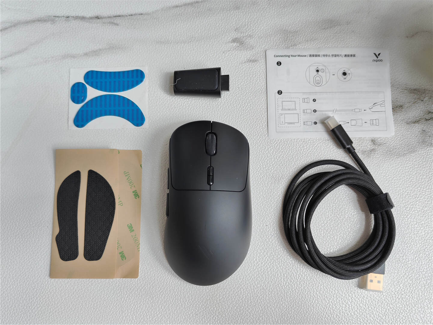 开箱过程中能感受到雷柏对细节的重视,尤其是收纳仓与配件的完整性设计,既满足玩家装机时的仪式感,又兼顾了日常使用的便利性,配件比我想象的丰富。包装清单:鼠标、说明书、备用“冰感” 电竞大脚贴、高速数据线、USB转Type-C转换头、Nano微型8K接收器,附件挺丰富的!还额外含有P3无线充电模块(需另购)。