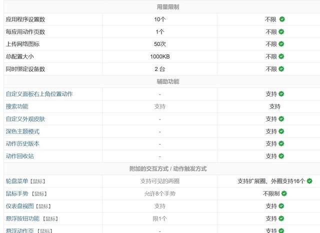 四、购买Quicker会员的好处Quicker账号是可以免费注册的,然而免费版的用户存在下图中间那列所示的用量限制(该图是2025年09月27日我在Quicker官网上截取的,由于列表很长,因此此处我只展示了列表较为靠近页面上部的部分)。而如果购买了Quicker会员(或者说是购买了Quicker专业版),您将享受该截图最右侧那列所示的特权: