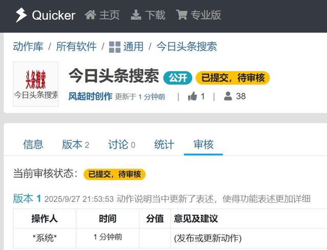 话说“今日头条搜索”是我开发的Quicker动作之一,今晚我对该动作又有做了点更新并重新提交审核。根据官网提供的统计数据,截至2025年09月27日22:07,已有38位用户安装和使用了该动作,并有1位用户对该动作给予了点赞。我所开发的Quicker动作,有一部分被我分享了出来,“今日头条搜索”便是其中之一。而说起Quicker,它是一款强大的自动化工具,可以帮助你提高学习效率、工作效率,简化日常操作。无论是文件管理、文本处理,还是网络搜索等领域,Quicker都能为你提供丰富的动作库,满足你的多种需求。