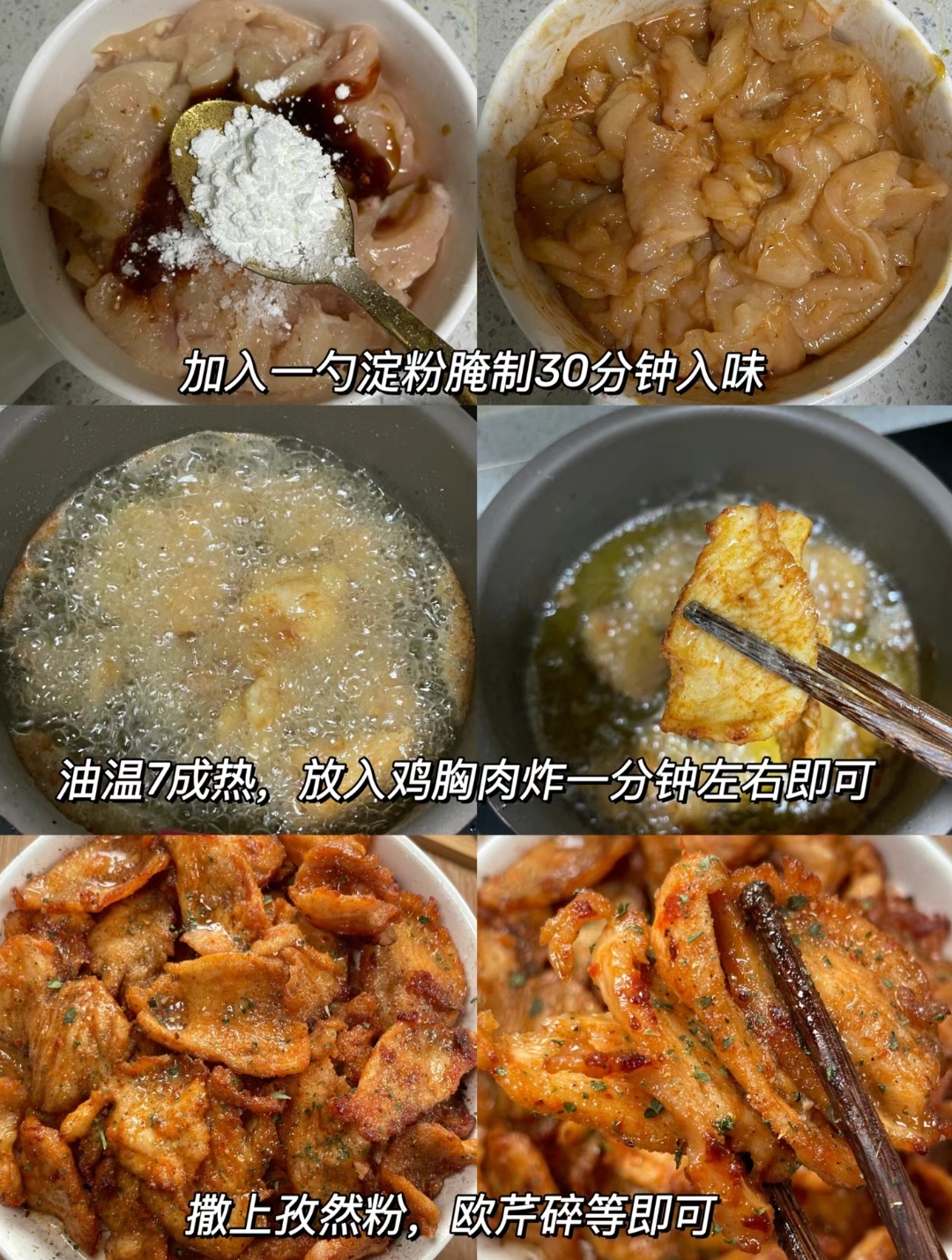 3.油温七成热,放入鸡胸肉炸一分钟左右即可