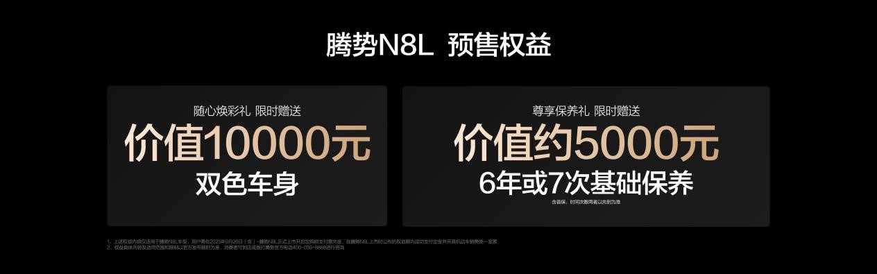 9 月 26 日,腾势汽车全新大六座安全豪华 SUV—— 腾势 N8L 正式启动预售,预售价区间为 31.98 万至 34.98 万元。作为腾势品牌旗舰豪华双子星矩阵的核心成员,该车与定位科技安全旗舰的腾势 N9 形成互补,聚焦家庭出行场景,以 “空间平等化、驾控精准化、安全极致化、智能场景化、设计东方化” 的五大核心优势,为出行提供一种智能与美感结合的可能性,重新定义高端家庭 SUV 的价值标准。即日起预订可尊享万元专属礼遇,包括价值 10000 元的双色车身焕彩礼与 5000 元基础保养,进一步提升产品竞争力。