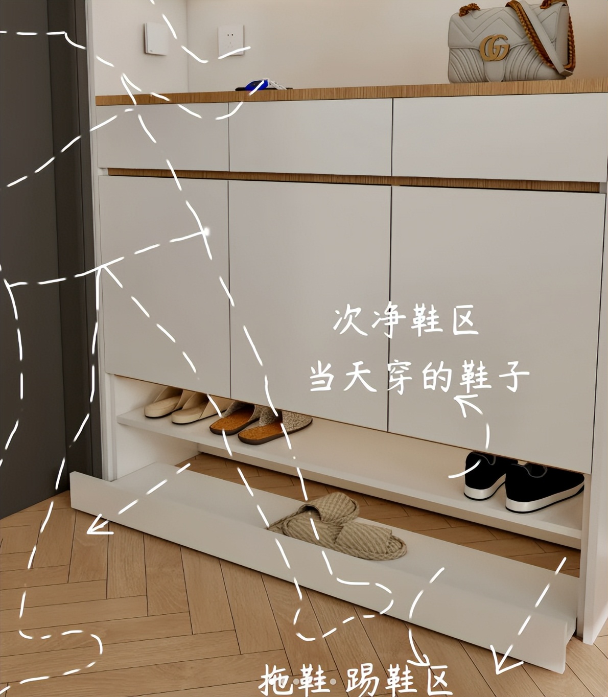 真正比较实用的做法,是在鞋柜下面留出两层的位置,一层放拖鞋,一层放平时穿的鞋子。