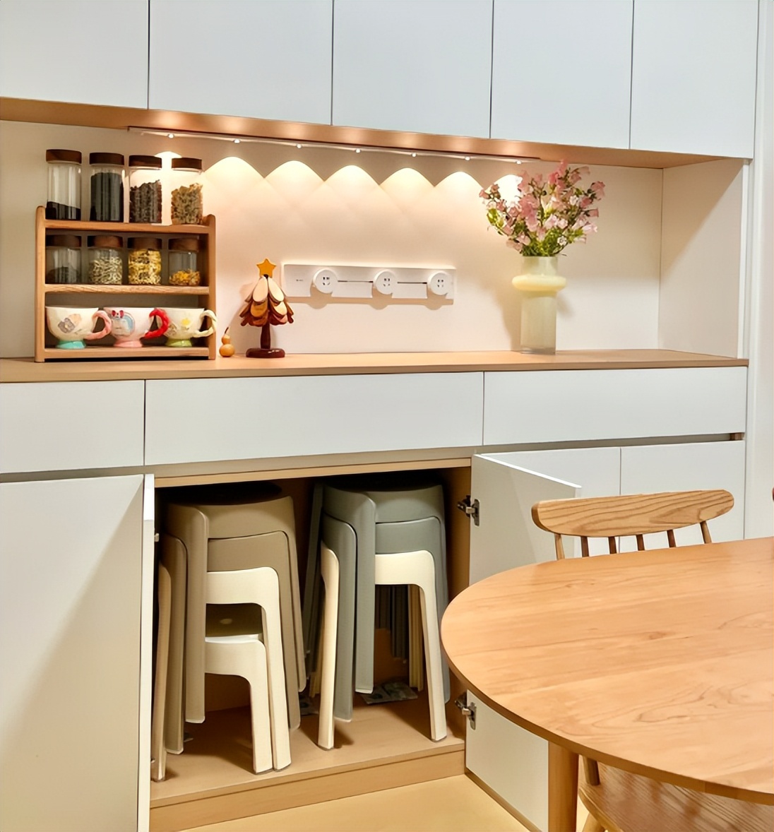 家里装修,如果装餐边柜的话,可以在餐边柜留出一个空间,把凳子的尺寸量好,餐椅就可以放进餐边柜里面了。