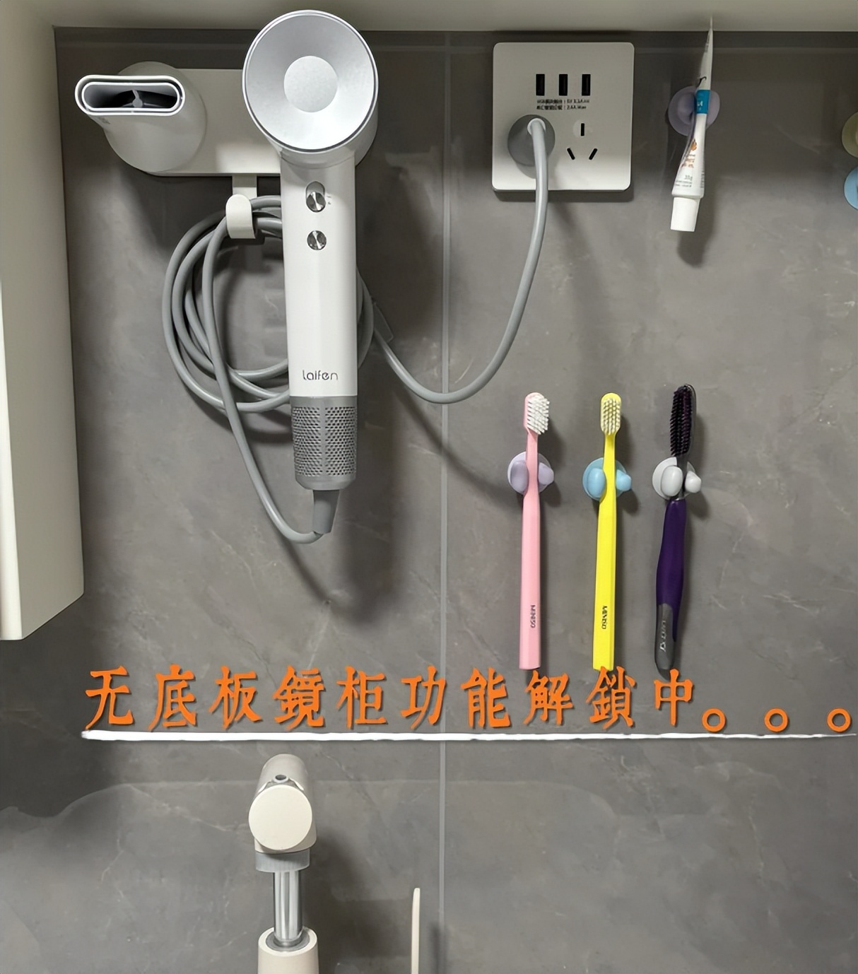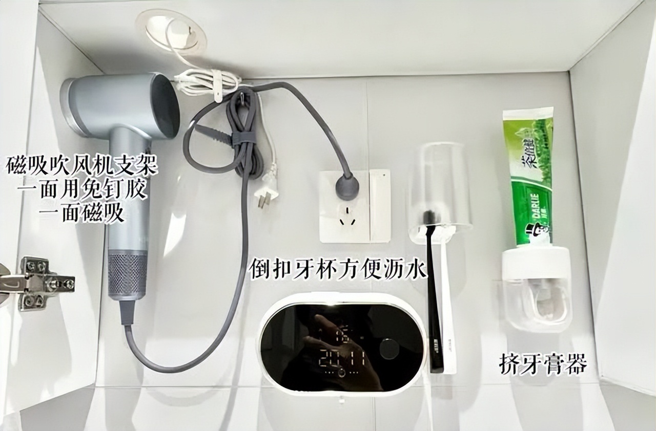 因为没有底板,所以可以把吹风机也放在镜柜里面,它的插头也不需要拔掉,直接插在插座上,大家可以选择带开关的插座。