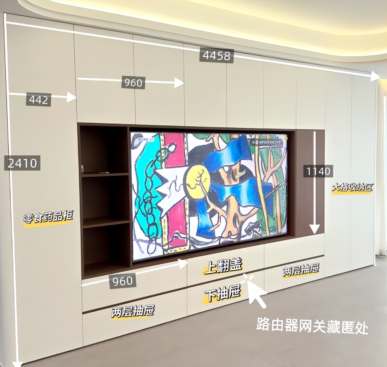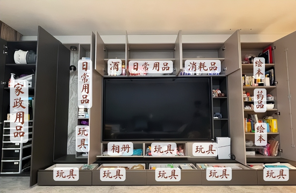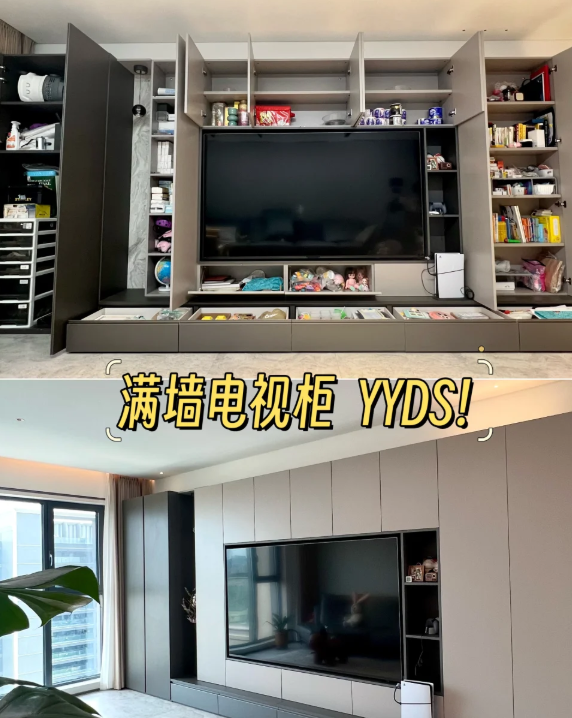 我家装修的时候,我就做了满墙电视柜,不管什么东西往里面一塞,柜门一关,根本看不到,家里永远都是干干净净的。