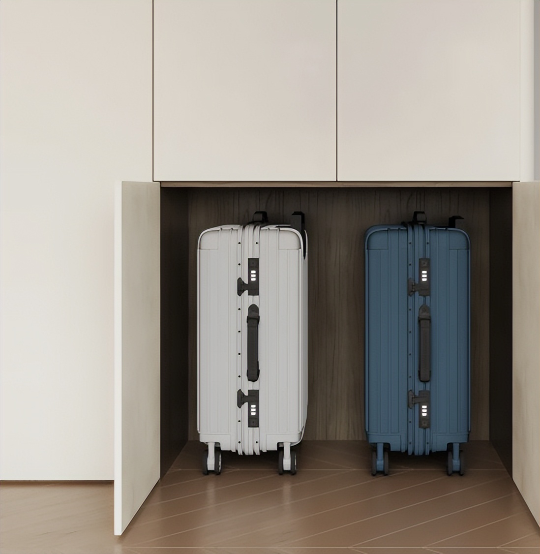 至于行李箱的收纳就更简单了,只需要在设计衣柜的时候预留出一个空间,不做底板,这样行李箱可以直接推进去。