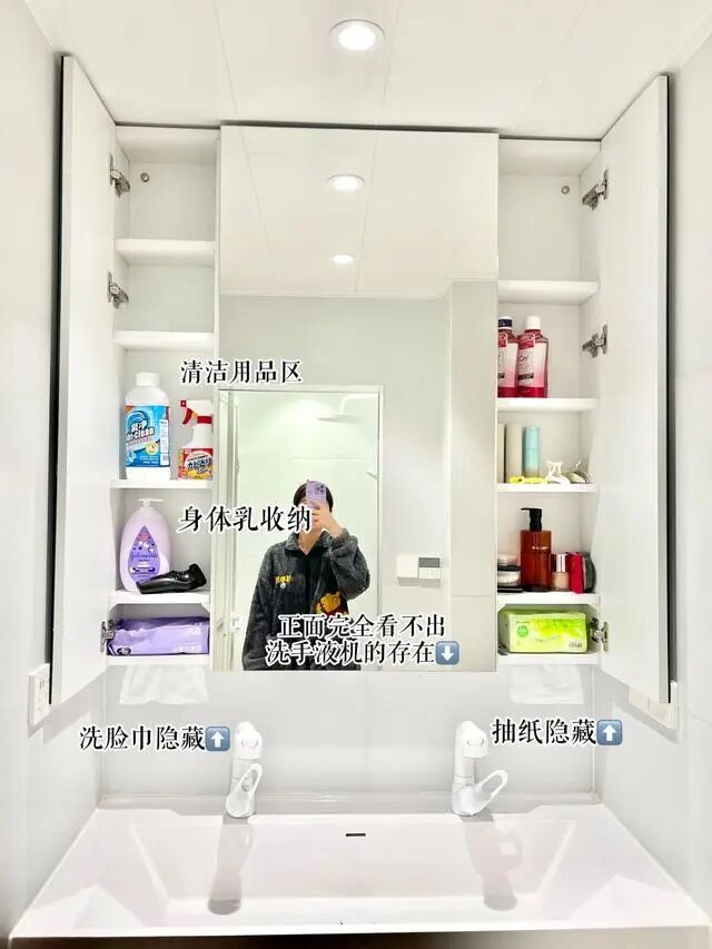 没有底板的设计,可以壁挂收纳牙刷、茶杯、牙膏,这样关上柜门的时候看不到这些杂物,视觉上特别整洁。