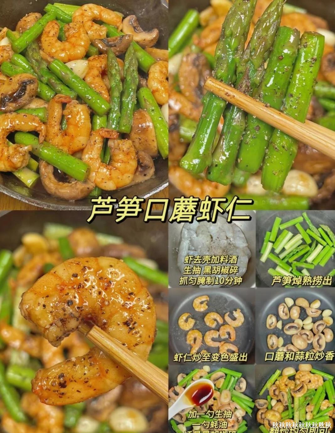 在锅中加入芦笋、炒好的虾仁和口蘑。