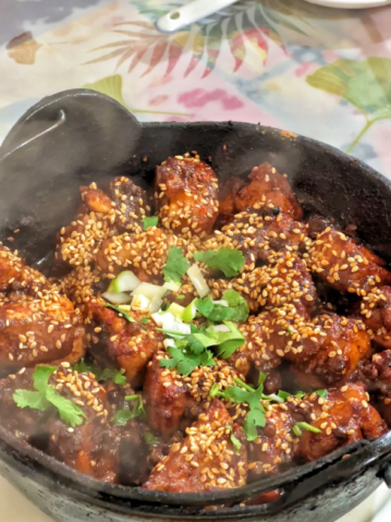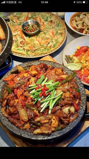 他们家主打韩式料理,推荐芝士炒鸡排!一口惊艳还有火辣辣的牛小肠、韩式烤辣白菜五花肉锅,炸奶酪土豆泥、都好好吃!人均吃下来才五六十