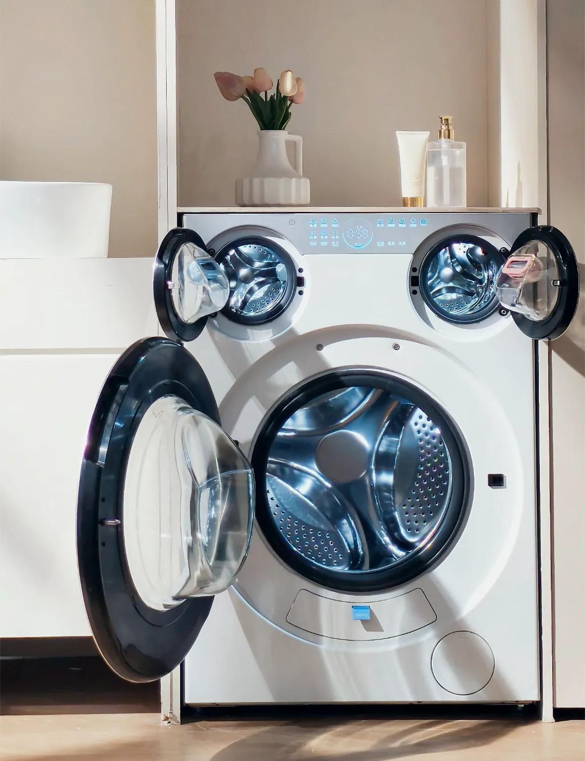 细节设计也特别贴家常:850mm 标准高度、595mm 宽度,不用砸墙、不用改水电,普通橱柜直接嵌入,小户型也能轻松放下。运行安静又稳,三桶同时转也不晃不吵,半夜洗衣不打扰家人。还能手机远程控制,下班路上开机,到家直接收干净衣服,上班族、带娃家庭直接解放双手。