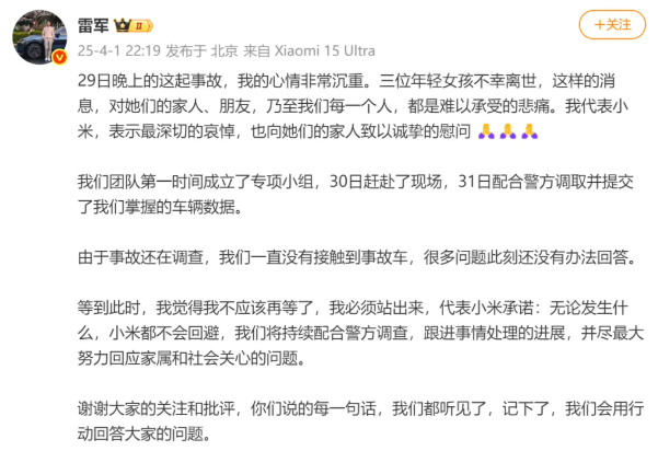 雷军深夜发声4月1日晚23时,雷军用“难以承受的悲痛”开启回应,承认专项小组已提交200+项行车数据。