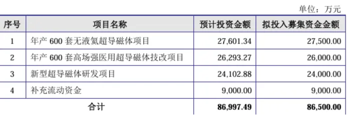 针对此次IPO,健信超导计划募集资金7.75亿元,其中2.75亿元用于年产600套无液氦超导磁体项目,2.6亿元用于年产600套高场强医用超导磁体技改项目,2.4亿元用于新型超导磁体研发项目。