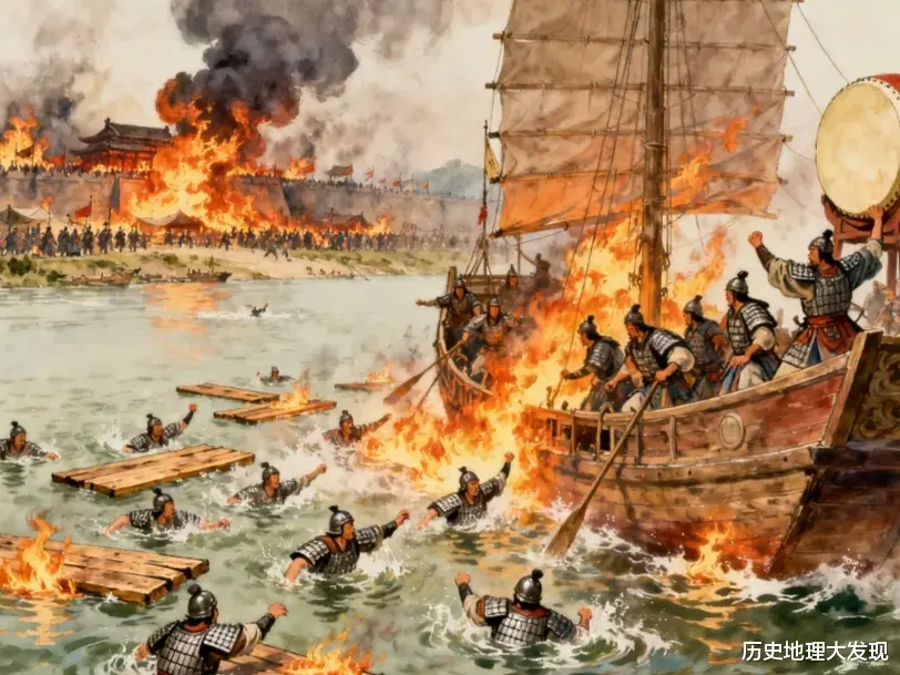 黄盖敏锐察觉到曹军船只相连的弱点,提出火攻之计,他亲自率领数十艘满载薪草、膏油的小船,假装投降,趁东南风起时冲入曹军船队,一举点燃了曹军的胜利美梦。