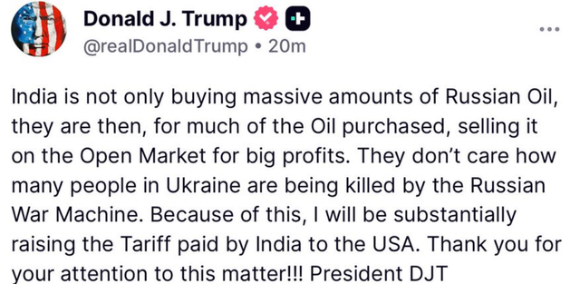 在另一边,川普在社交媒体上发文说:“印度不仅从俄罗斯购买大量石油,还用俄罗斯石油在市场公开贩卖赚取利润,完全无视多少乌克兰平民死于俄罗斯。我将大幅提升对印度的关税。”