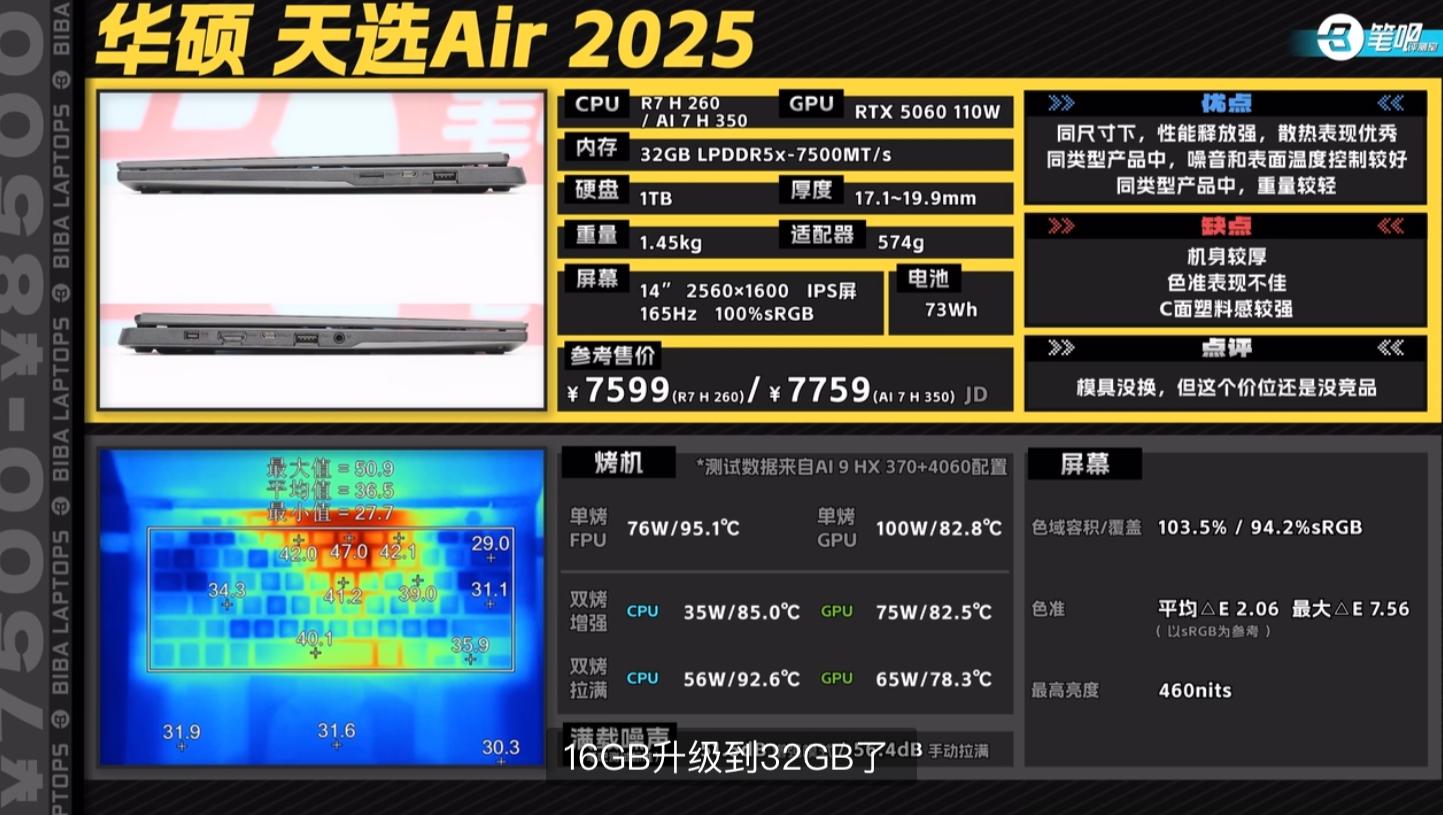 综合看下来,天选Air 2025确实是14英寸新品笔记本中难得的“全都要”之选,目前结合国补和返E卡活动,AMD锐龙AI7 H 350+RTX5060版本 最低到手价约7260,AMD锐龙7 H 260+RTX 5060版本到手价约7100,可以说真香十足。618期间,如果想选择一款兼顾“游戏本性能+轻薄本便携体验”的新品机型,那么#华硕天选Air# 2025无疑是理想之选。你会选哪个版本呢?