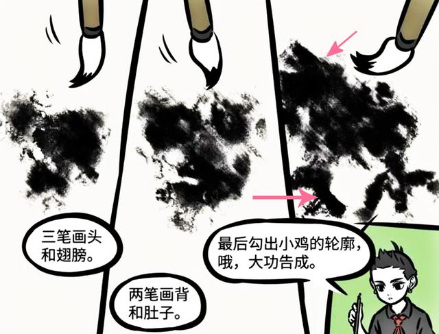 不过,这幅画,显然是哪咤用了太多的颜料。只有在后面的图片中,我们才能隐约看出那是一只鸡,它的爪子和头颅还勉强能看到。