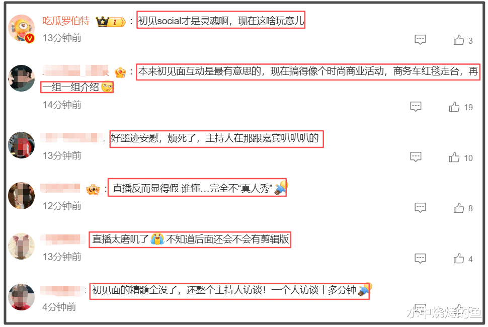 网友们彻底坐不住了,认为这样的直播模式非常不讨喜,全程看得人昏昏欲睡想快进,和之前的初见面相比天差地别,真人秀也彻底变了味儿。