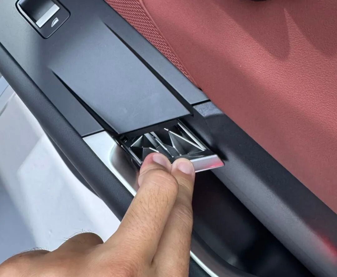 其次,关于碰撞后的安全措施,如同开头所说的,市面上的隐藏门把手品类、品牌很多,每个企业的安全逻辑也不同,对于安全层面可以从两个维度考虑,第一个车内人员,可以制定标准,使用电动开启车门的车内门把手设计,必须与紧急开门的机械开关进行一体化设计,目的是让车内人员在紧急情况下,在本能操作的基础上,直接拉开车门。第二个车外救援人员,最直接的方法就是门把手弹出,同样机械打开方式与门把手一体化设计,弹出的门把手直接拉拽就是机械打开方式。