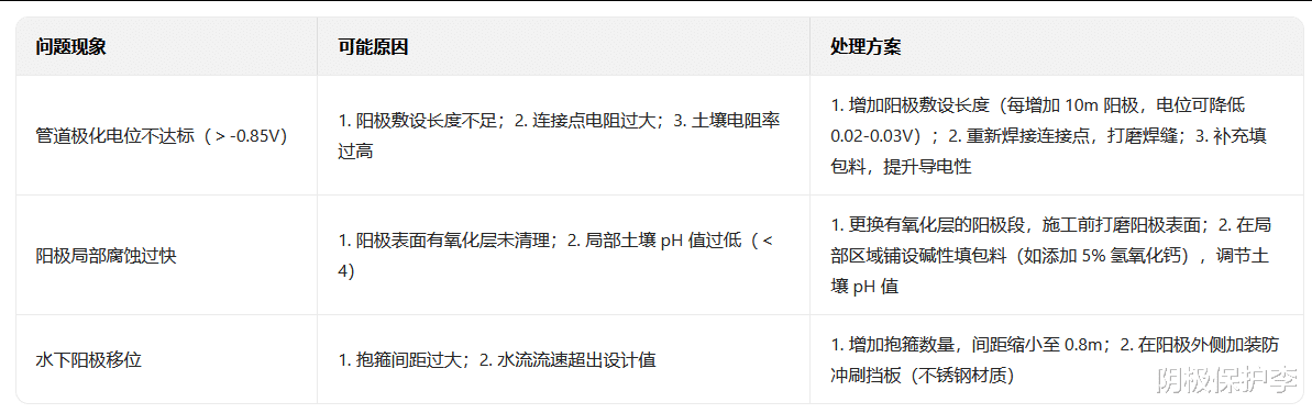 短期维护(每 1 年 1 次):检测管道电位、连接点电阻,若电位回升至>-0.8V,需检查阳极是否损耗或连接是否松动;
