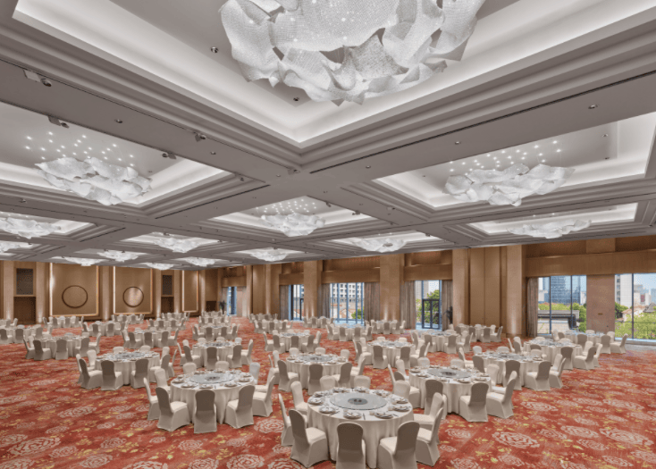 酒店大宴会厅以1380平方米的无柱开阔空间,配以挑高设计,可轻松容纳千人盛宴,犹如一幅徐徐展开的巨幅画卷,融合先进影音系统与灵活璀璨灯光布局,营造沉浸式感官体验,为各类活动提供兼具气度与美感的理想场域。