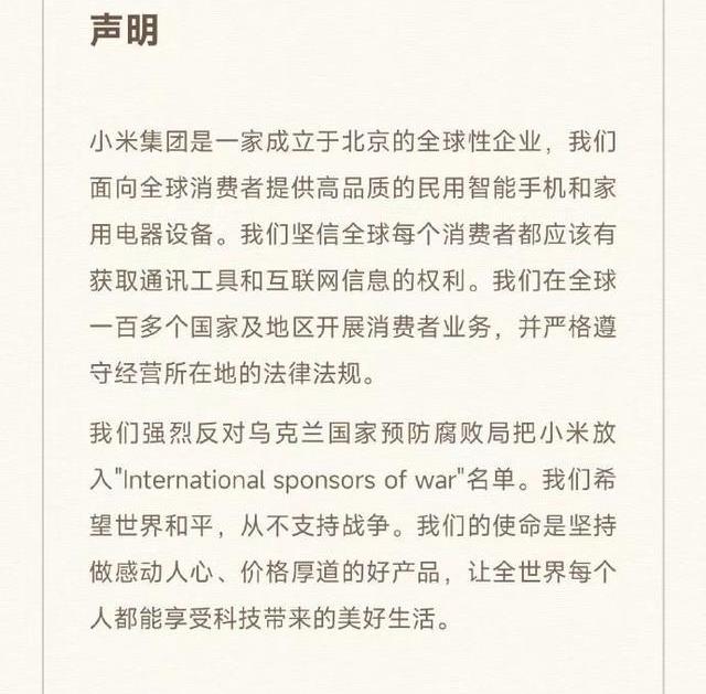 小米集团是一家成立于北京的全球性企业,我们面向全球消费者提供高品质的民用智能手机和家用电器设备。我们坚信全球。我们在全球一百多个国家及地区开展消费者业务,并严格遵守经营所在地的法律法规。我们强烈反对乌克兰国家预防腐败局把小米放入"Internationalsponsorsofwar"名单。我们希望世界和平,从不支持战争。我们的使命是坚持做感动人心、价格厚道的好产品,让全世界每个人都能享受科技带来的美好生活。