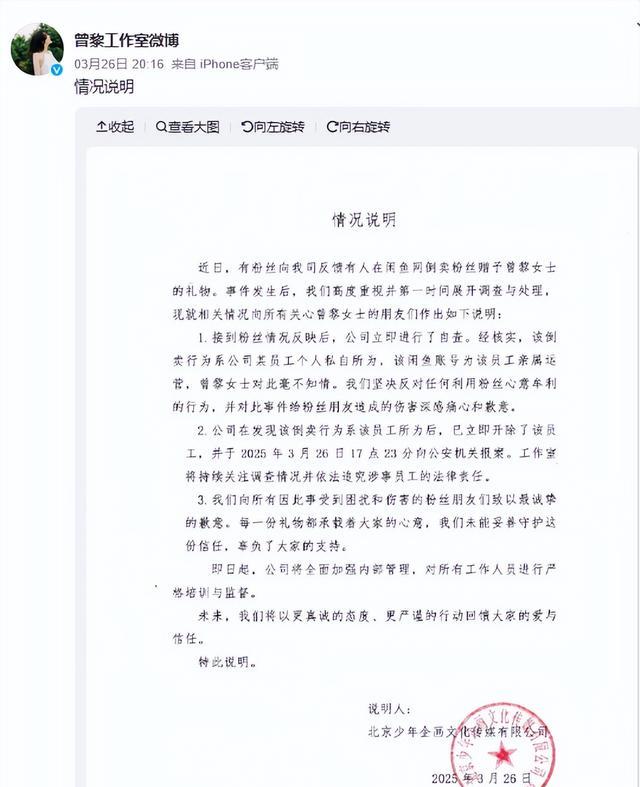 事情得到曝光后,曾黎工作室发表情况声明,称此行为是工作室某员工私自行为,曾黎对此毫不知情,已对该员工已做出处理,将依法追究该员工的违法行为。