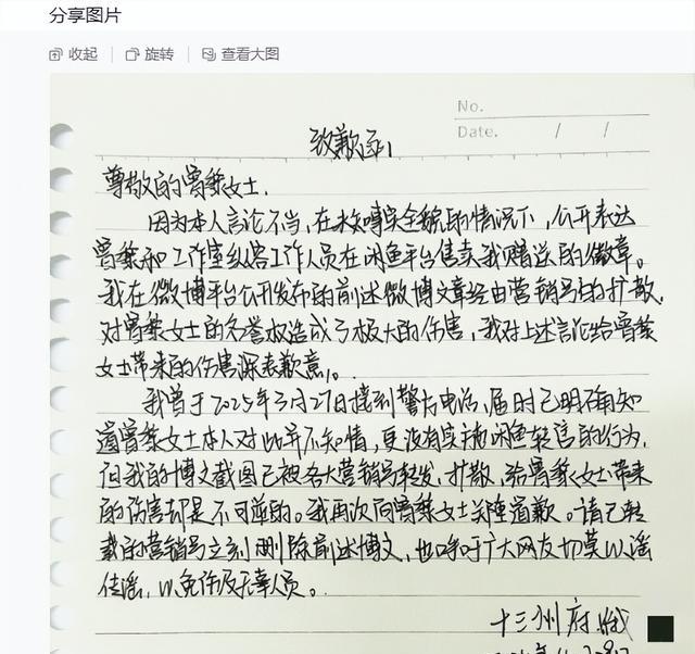 粉丝致歉信中写道,称自己因为不当言论导致曾黎女士声誉受损,对自己的言论对曾黎女士造成的巨大伤害表示歉意,希望网友以此为戒,注意言论。