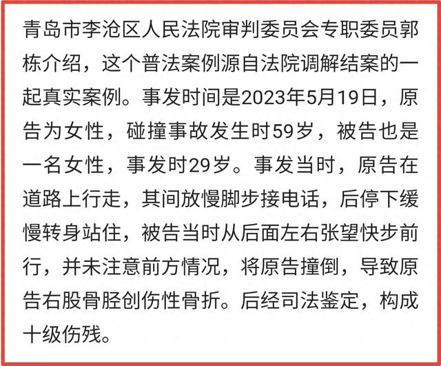 原本的案情,两人同向行走,原告突然转身,与后面的被告相撞,在这种情况下,法官认定原告负主要责任,被告负次要责任,在此基础上然后才进行调解。