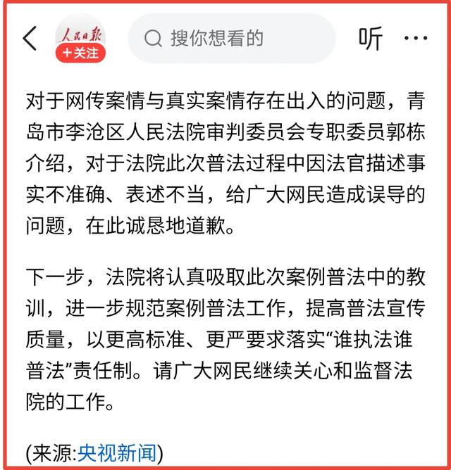 现在这个事儿有了大反转,法院出来道歉,央视新闻与人民日报都发布了对事件的调查,澄清了一些事实,以证明是有关人员在做普法案例时进行了变动,使得普法中所讲的与实际案例有较大出入。