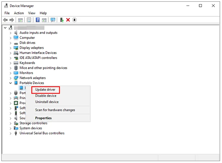 右键单击“开始”按钮,打开“设备管理器”,找到“便携设备”,右键单击您的 iPhone ,然后选择“更新驱动程序”。