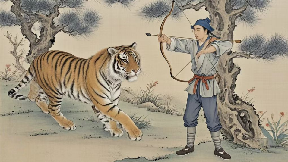过了一会儿,一阵冷风吹过,王小路醒了过来。他惊讶地发现自己没被老虎吃掉,再一看,原来老虎刚才一跃,卡在两棵树中间了,前进不了,后退不得。王小路心想,这可是个好机会啊。他把背上的弓取下来,左一箭右一箭,把箭都射光了,老虎不一会儿就死了。整个老虎他也带不走啊,就拿着腰里别着的砍刀把一个虎腿砍下来,扛着下山了。