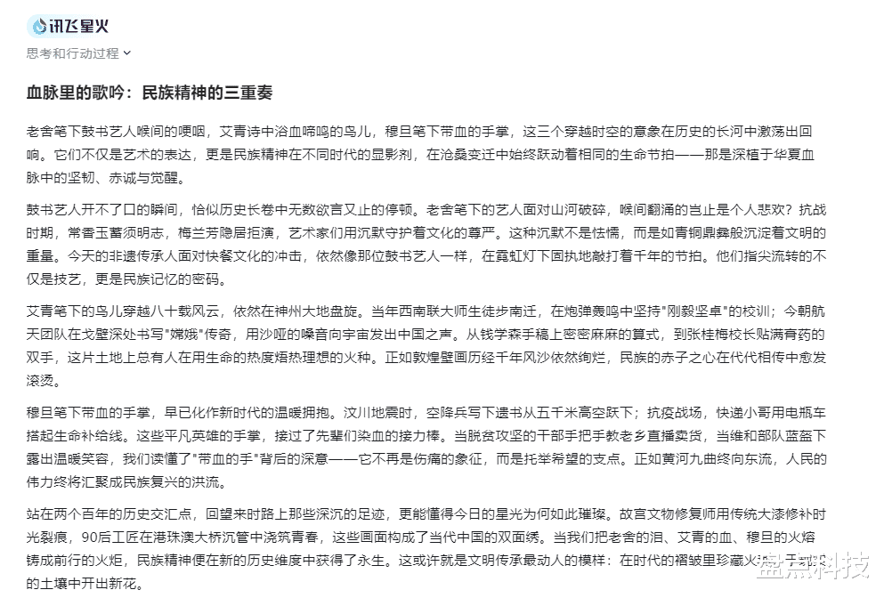 结合科技媒体“电厂”中的评价,可以看到,纯血国产大模型更懂民族精神内涵。开篇点睛,通过老舍、艾青、穆旦作品中的经典形象,凝练出中华民族"坚韧、赤诚、觉醒"的精神内核。随后以梅兰芳蓄须明志、非遗传承、西南联大南迁、航天奋斗等历史与现实案例,展现文化坚守与赤子之心的传承。最后用汶川抗震、抗疫救援、故宫修复、大桥建设等新时代实践,全文通过"古今熔铸"的叙事手法,将文学意象、历史记忆与时代精神编织成一个整体,这些都是“民族魂”的具象表达——而这恰恰是数智化时代人类不可替代的情感厚度。真不愧是全国产自主可控的大模型——讯飞星火。