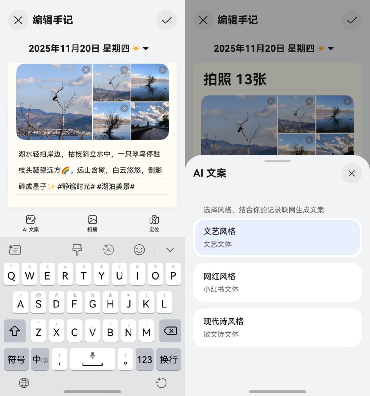 旅行回来翻照片,小艺时光机还可以把这些照片生成手记,文案都能帮我搞定!它有三种风格:文艺风格、网红风格和现代诗风格,我挨个试了下,不仅文采都不错,而且画面里面小小的一只翠鸟都能准确识别,文案瞬间有灵魂了!