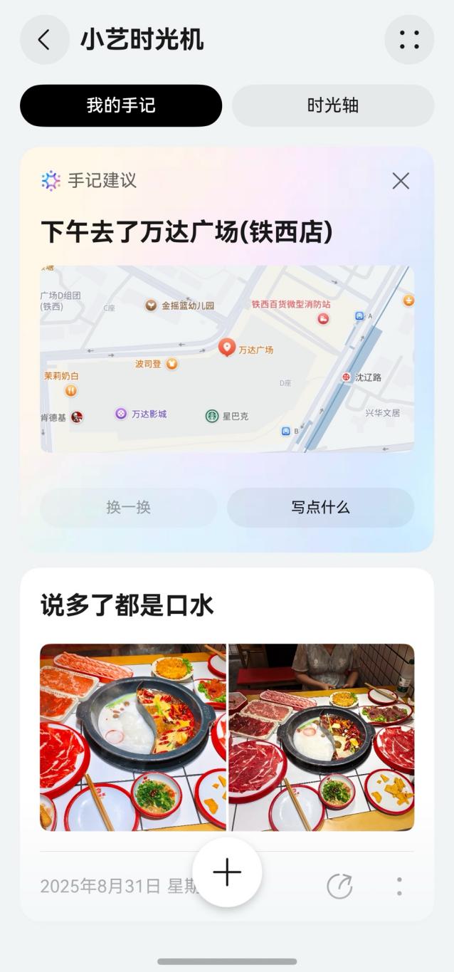 此外,还有一个让我惊喜的点,就是它的主动服务能力。每当我抵达新的城市或地点,小艺时光机的主页都会贴心地弹出手记建议。比如我下午刚去过万达,就收到了“写点什么”的提示,我秒点击,一分钟产出小手记,效率拉满!