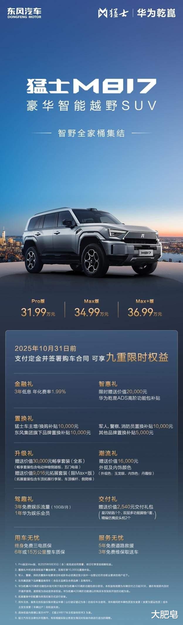 补全长续航关键拼图,智能越野体验再升级!9月29日,东风猛士科技与华为联手打造的豪华智能越野SUV猛士M817长续航新成员——猛士M817 Max+版正式上市,官方指导价36.99万元,10月31日前支付定金并签署购车合同,可享九重限时权益,轻松开启全域智野新体验。