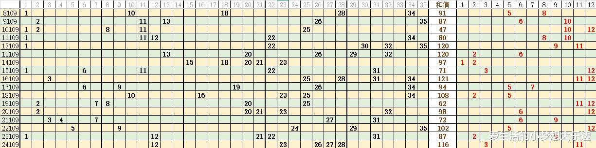 历史同期五区区间比为18:15:12:22:18。和值平均在92.5,整体和值比上期高3分左右,属于中间和值范围。最低和值47,在10年期。最高和值121,在16年期。开出 70 以下的和值1次,开出120 以上和值3次,偏好开出中间和值。五区出号中,四区出号最多,三 区出号最少。近期大小和值交替开出,上期再次开出较大和值范围,本期看好和值开出中间偏大和值范围,看好和值开出在90—110左右。