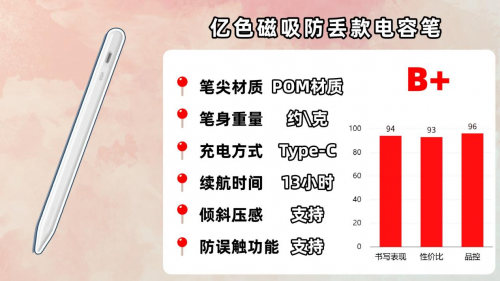 这款电容笔的外观辨识度较高,采用了金属按键开关,按下即可快速使用,非常方便。而且笔身材质为铝合金,手感扎实且重量轻巧,净重约13克,长时间握持也不会太累。书写上,它内部配备了双核AI传导芯片和一体式笔芯,保证了信号传输稳定,书写顺滑自然。充电方面,它使用了Type-C接口并支持快充技术,仅需30分钟就能充满电,还可以连续使用约12小时,基本能满足日常学习、办公或绘画需求。不过磁吸功能一般,吸附在iPad上容易出现轻微移位。