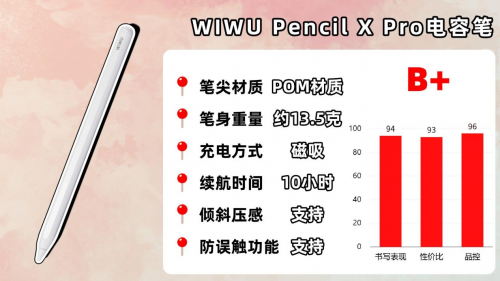 这款电容笔的质感不错,使用了原生烤漆材质,握持时舒适,但笔身净重就有16g左右,长时间书写握笔的话对手腕的负重感还是比较明显的,建议使用一段时间后就停下来放松一下手腕。而且它配备了专属app、自定义快捷键和镀金笔头,书写起来比较精准灵敏,也支持防误触功能,可以把手掌自由搭在屏幕上。另外它的续航很持久,长达35小时,轻度使用的话可以做到一周一充,但充电口与开关键都在握笔区域,不仅硌手,还不人性化,这点相对其他主流电容笔要逊色一些。