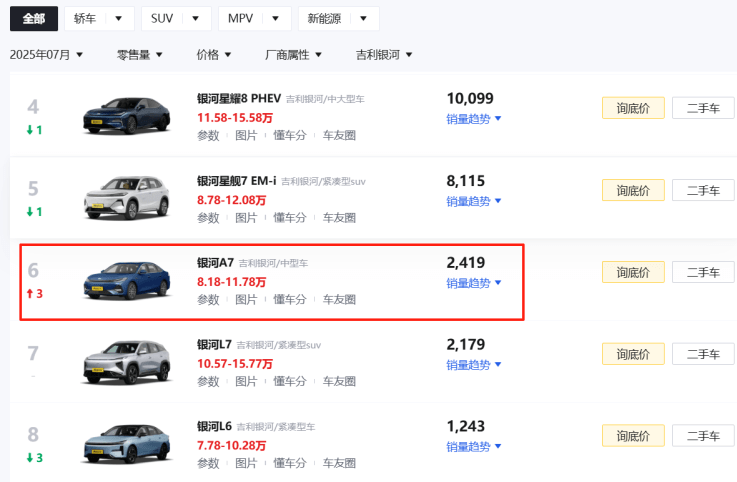 新车是8月8日上市的,而销量数据是从7月份开始就“乘上快车”起来的。有乘联会数据统计,吉利银河A7单7月这一个月就取得了2,419辆零售销量成绩,这一数据代表了什么呢?对比自家上市已经有不少日子的主力轿车产品就能看出端倪。银河E8定位纯电中大型车,同期零售销量444辆;银河L6定位插混紧凑型轿车,当月零售量1,243辆。