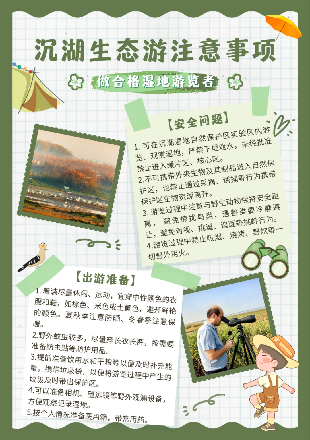 一是建立沉湖湿地巡查专班,严格落实监管监护机制。组建湿地巡查管护专班,每周定时定点对沉湖湿地保护区管理范围开展常态化巡护,捡拾白色垃圾、清理堤岸游步道枯木杂草,保持湿地保护区内良好的环境卫生。