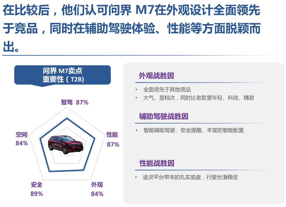扎实的产品力最终转化为极高的用户满意度。报告显示,基于实际使用体验,车主对问界M7的NPS(净推荐值)达到85%,平均推荐打分高达9分(满分10分)。在推荐理由中,驾驶性能与操控、质量与可靠性、电池续航与充电位列前三。