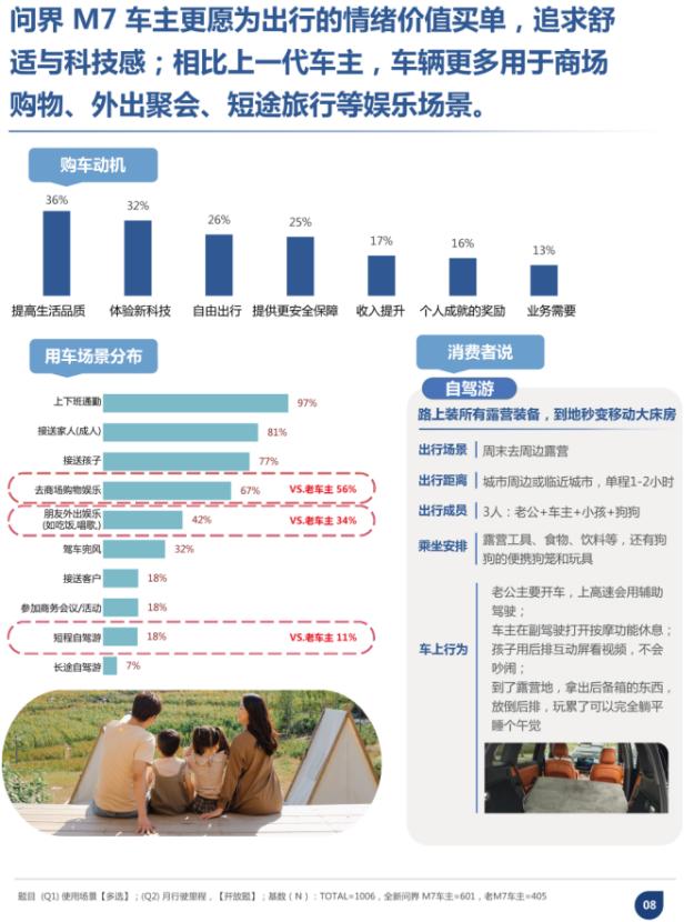 与传统购车者不同,问界M7的车主更崇尚“品质生活”与“亲子陪伴”的双重价值。报告显示,近四成用户选择问界M7的直接动机是“提升生活品质”。在日常用车场景中,接送家人、商场购物、外出聚会、短途旅行占据了主要比例,而车主们丰富的爱好,美食打卡、骑行、露营、滑雪等,则进一步拓展了车辆的使用边界。