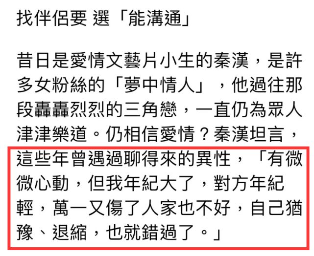 不过在采访中,秦汉曾透露自己也遇到过令人心动的异性,但考虑到双方存在年龄差距,对方太年轻怕伤了人家,所以一直没有选择主动,正所谓“犹豫就会败北”,一些缘分就这样遗憾错过。